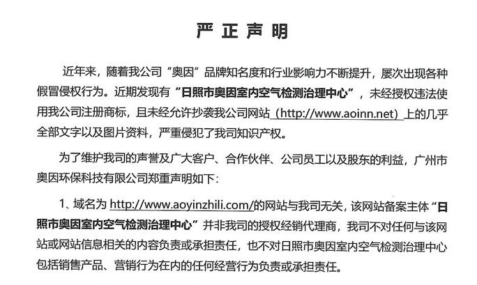 近年來,隨著我公司“奧因”品牌知名度和行業(yè)影響力不斷提升,屢次出現(xiàn)各種假冒侵權(quán)行為。近期發(fā)現(xiàn)有“日照市奧因室內(nèi)空氣檢測(cè)治理中心”,未經(jīng)授權(quán)違法使用我公司注冊(cè)商標(biāo),且未經(jīng)允許抄襲我公司網(wǎng)站的資料。