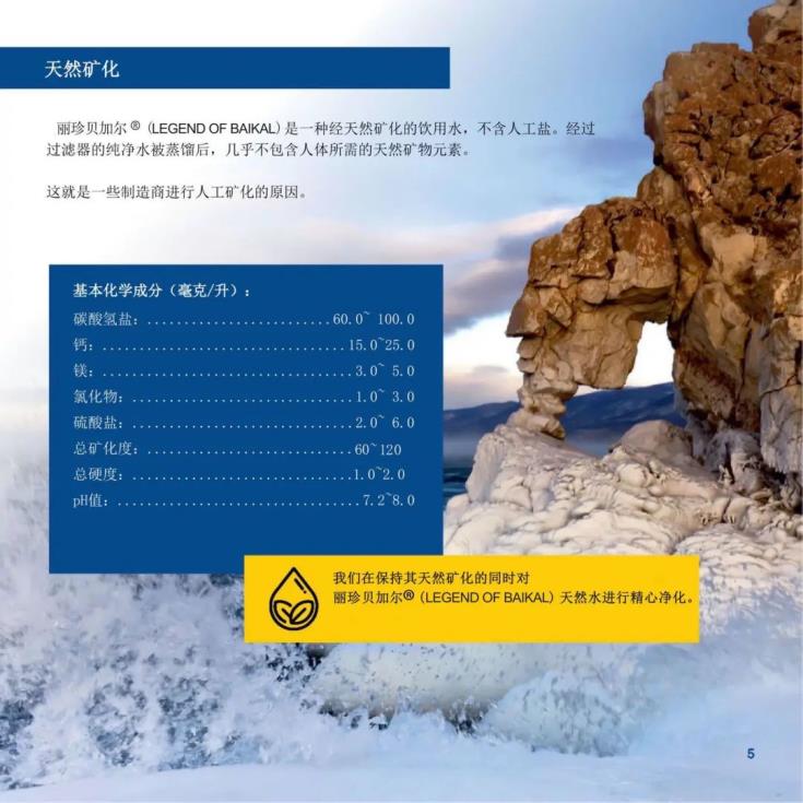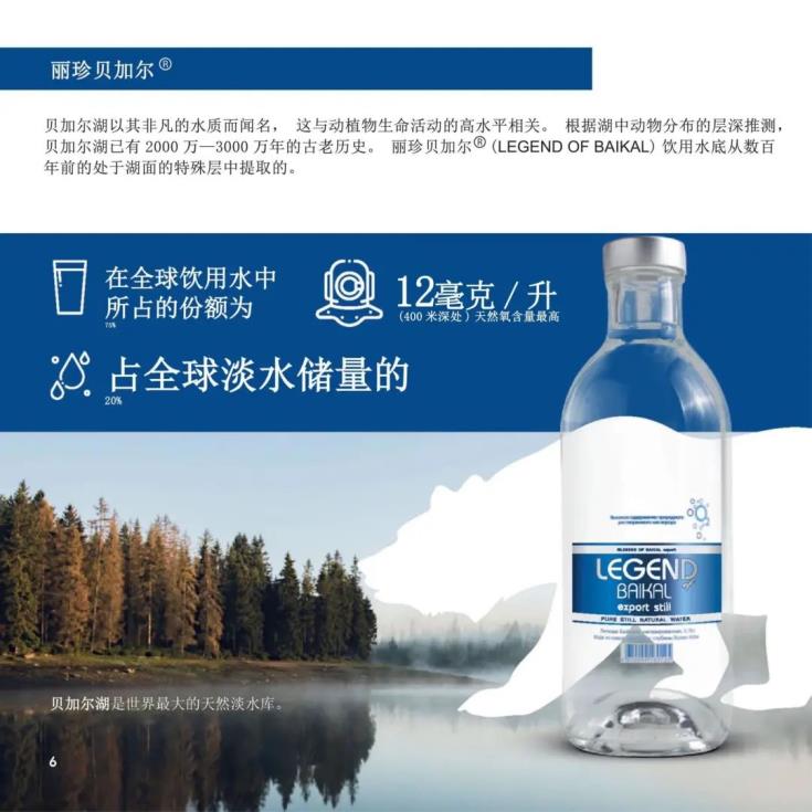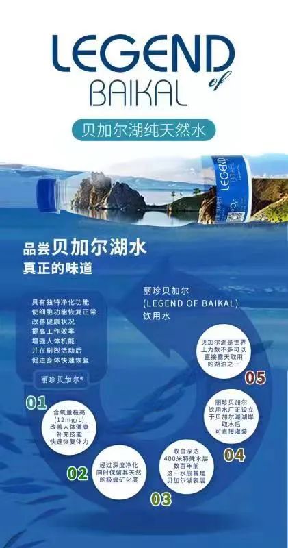 我司麗珍貝加爾?(LEGEND OF BAIKAL)純天然飲用水直接取自于貝加爾湖深水層,并經(jīng)過精心凈化后傳送至裝瓶線,其水本身含氧量豐富,天然礦化保留了其天然的弱堿性。
