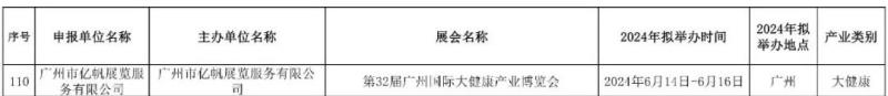 這周,廣東省商務廳發布了《關于印發2024年“粵貿全國”活動目錄的通知》。《通知》公布了2024年“粵貿全國”境內展會活動目錄,其中由廣州市億帆展覽服務有限公司主辦的第32屆廣州國際大健康產業博覽會入選此目錄。