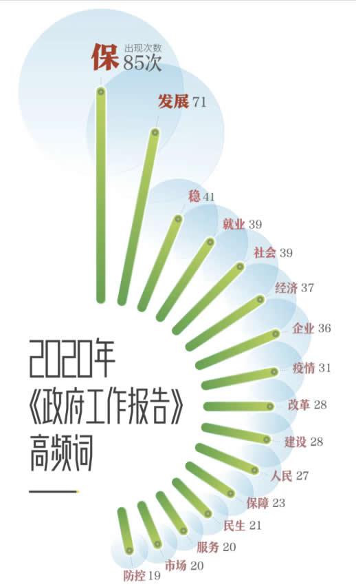 “穩就業、保民生”貫穿整份報告。在2020年《政府工作報告》中,“保”是出現頻次最高的詞,共出現85次。