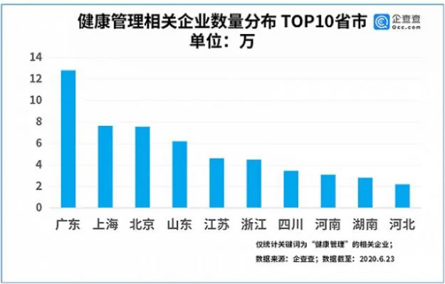 據了解,歐美等國的健康產業生產總值占GDP的比重超過15%,而國內僅為5%左右,未來發展空間巨大。企查查數據顯示,我國共有健康管理相關企業77.37萬家,其中企業狀態為在業/存續的共64.18萬家。