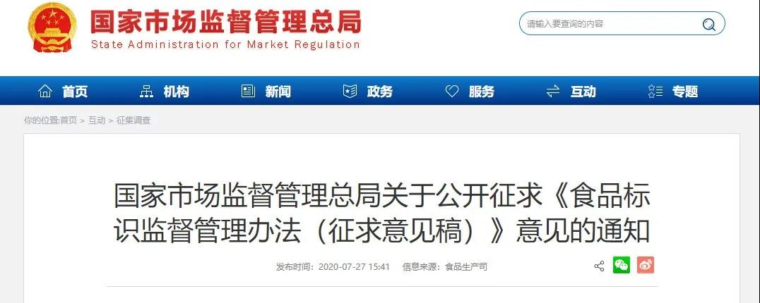 國家市場監督管理總局關于公開征求《食品標識監督管理辦法(征求意見稿)》意見的通知