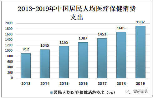 中國居民人均醫療保健消費支出逐年增加,2013年中國居民人均醫療保健消費支出僅為912元,2019年中國居民人均醫療保健消費支出達1902元,較2018年增加217元。