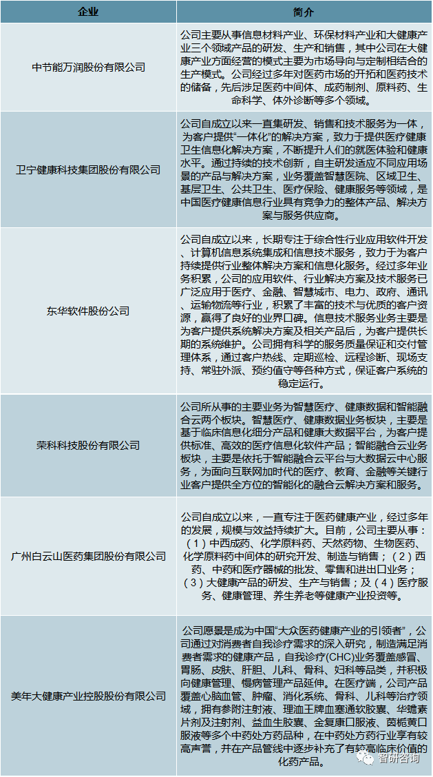 隨著中國居民健康意識的增強和健康需求的不斷上升,健康中國已經上升為國家戰略,大健康產業蘊含著無限商機,正在成為中國或各省國民經濟中名副其實的支柱型產業,也越來越多企業進入大健康行業,其中包括:中節能萬潤股份有限公司、衛寧健康科技集團股份有限公司、東華軟件股份公司、廣州白云山醫藥集團股份有限公司等企業。