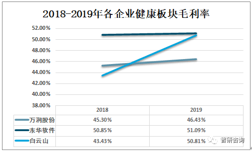 2018年萬潤股份、東華軟件及白云山大健康板塊毛利率分別為45.30%、50.85%、43.43%;2019年萬潤股份、東華軟件及白云山大健康板塊毛利率分別為46.43%、51.09%、50.81%。