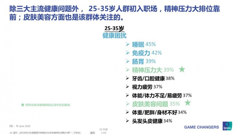 益普索Ipsos調研顯示,84%的人認為自己比以前更關注健康了,25歲及以上的中青年群體對健康的關注水平明顯提升,近一半的人對自身健康比較滿意。世界衛生組織在2016年發布的數據,目前全世界亞健康人口總占比高達75%,真正健康的人只有5%。