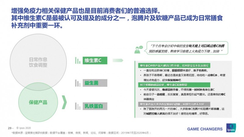 維生素C對身體的益處多多,不僅可以提高身體免疫力還有抗衰老等豐富功效。益普索社媒研究數據顯示,維生素C是最被消費者認可和經常提及的成分之一,富含維生素C的泡騰片及軟糖產品,已成為日常膳食補充劑中的重要一環。