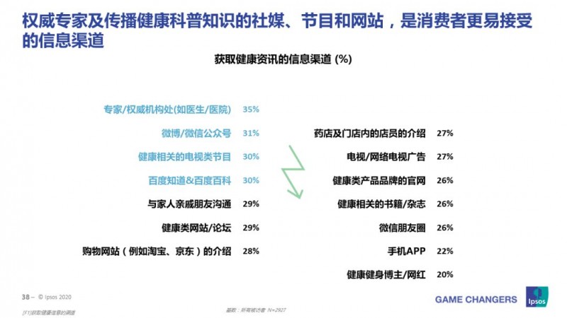 在信息獲取上,權威專家(35%)及傳播健康科普知識的社媒(31%)、節目(30%)和網站(30%),更容易被消費者接納。