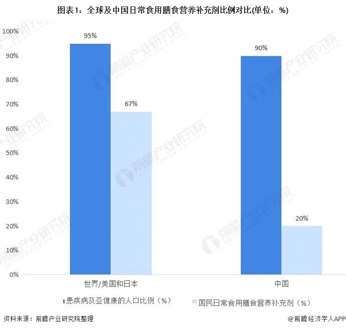 膳食營養補充劑面向的消費者大多是存在健康問題的亞健康人群。根據世界衛生組織的調查,全世界患疾病及亞健康的人口比例已達95%,中國亞健康和患病人口比例高達90%。這些人群都需要通過膳食或營養補充劑來改善健康狀況。膳食營養補充劑在歐美等國已有較為久遠的發展歷史,在美國和日本,均有67%的國民日常食用膳食營養補充劑,而在中國,膳食營養補充劑還是一個新興的行業,食用比例低于20%。