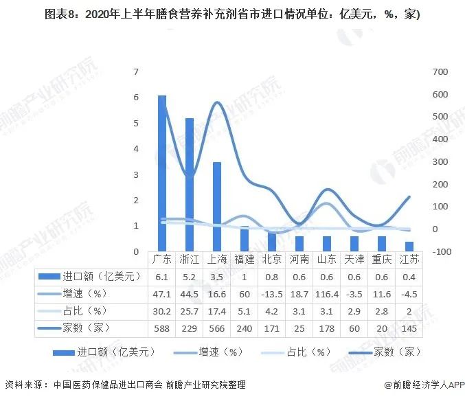 我國膳食營養補充劑食用水平低于世界平均水平,在中國,膳食營養補充劑還是一個新興的行業,導致我國膳食補充劑市場較為分散,故我國膳食營養補充劑大量依靠進口,2020年上半年進口膳食補充劑貿易增幅大,我國膳食營養補充劑作為新興行業,尚處于起步發展階段,未來發展空間巨大。