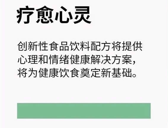 “功能性配方和具有情感吸引力的多感官產品將幫助食品、飲料和餐飲品牌在眾多心理和情感選擇中占據更大份額。我們預測,創新性食品飲料配方將幫助人們了解飲食可以如何影響心理和情緒健康,這將引起消費者對基于心理學的健康飲食方式產生新興趣?!?/p>
