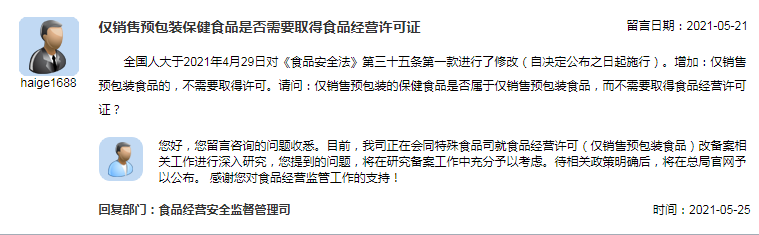 全國人大于2021年4月29日對《食品安全法》第三十五條第一款進行了修改(自決定公布之日起施行)。增加:僅銷售預包裝食品的,不需要取得許可。請問:僅銷售預包裝的保健食品是否屬于僅銷售預包裝食品,而不需要取得食品經營許可證?答:您好,您留言咨詢的問題收悉。目前,我司正在會同特殊食品司就食品經營許可(僅銷售預包裝食品)改備案相關工作進行深入研究,您提到的問題,將在研究備案工作中充分予以考慮。待相關政策明確后,將在總局官網予以公布。感謝您對食品經營監管工作的支持!