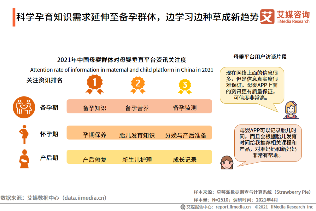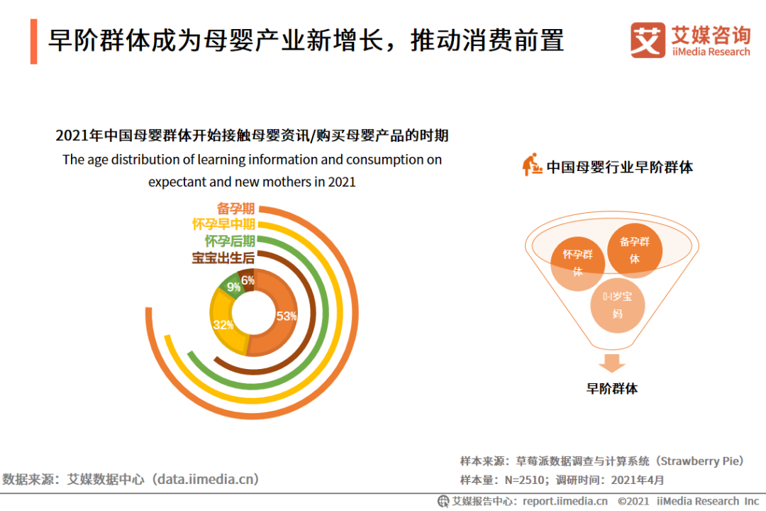 早階群體包括備孕期、懷孕期及0-1歲的寶媽群體,數據顯示2021年中國有53%的母嬰群體從備孕期就開始接觸母嬰資訊和相關產品。隨著母嬰消費的階段不斷前置,早階群體逐漸成為母嬰消費的新力軍,營銷價值巨大。