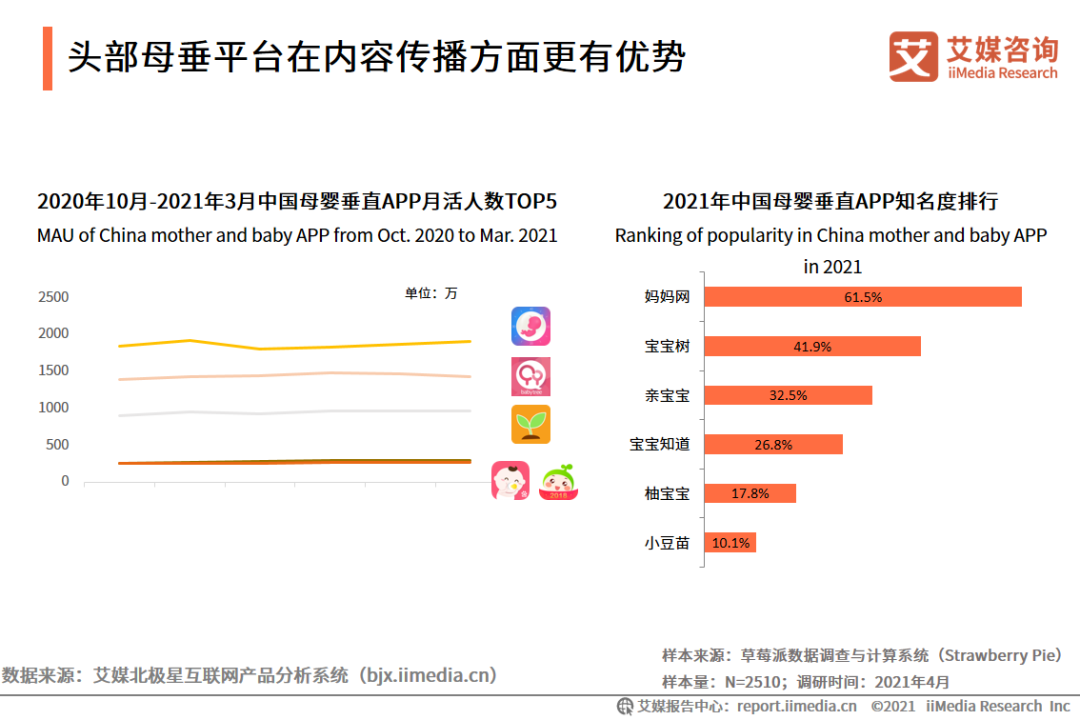 數據顯示,目前中國母嬰垂直APP中,月活數量過千萬的平臺有兩家,分別是媽媽網和寶寶樹,其中媽媽網平均月活人數已迫近2000萬。艾媒咨詢分析師認為,互聯網社群交流已經逐漸成為媽媽群體最為倚重的信息交流渠道之一,而頭部母嬰群體擁有大量的用戶基礎和品牌知名度,在社群傳播領域擁有較大的優勢,能幫助平臺不斷拓新,形成良好的口碑效應。