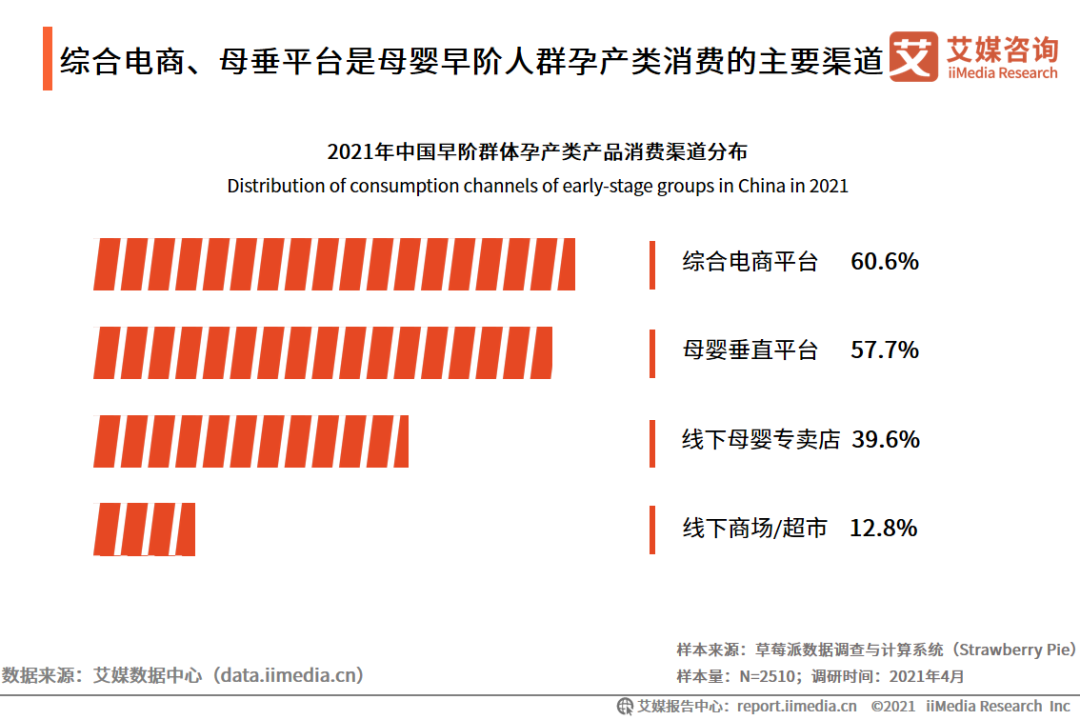 iiMedia Research(艾媒咨詢)數據顯示,早階群體孕產產品方面的消費渠道以綜合電商和母垂平臺為主,分別占比為60.6%和57.7%。艾媒咨詢分析師認為,母垂平臺對于媽媽群體特別是早階群體來說使用頻率高,且影響力強,依靠平臺的專業性和內容豐富度,母垂平臺能建立起較高的用戶信任度。而隨著母垂平臺的電商屬性加強,其內容轉化的潛力也不斷增加,有望成為早階群體最主要的孕產類產品購物渠道。