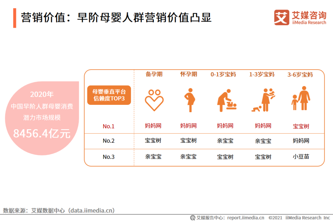 據iiMedia Research(艾媒咨詢)測算,2020年中國母嬰早階人群消費潛力市場規模超過8400億元,人群營銷價值逐漸凸顯,是母嬰品牌的主要藍海市場。對比其他母嬰垂直平臺App,媽媽網在早階人群使用率最高,艾媒咨詢分析師認為,母嬰品牌要有效獲得這一群體的關注,需要選擇媽媽網等TA(Target Audience)濃度最高平臺,精準觸達早階人群,以此提升品牌競爭力,推動品牌快速占據早階市場。