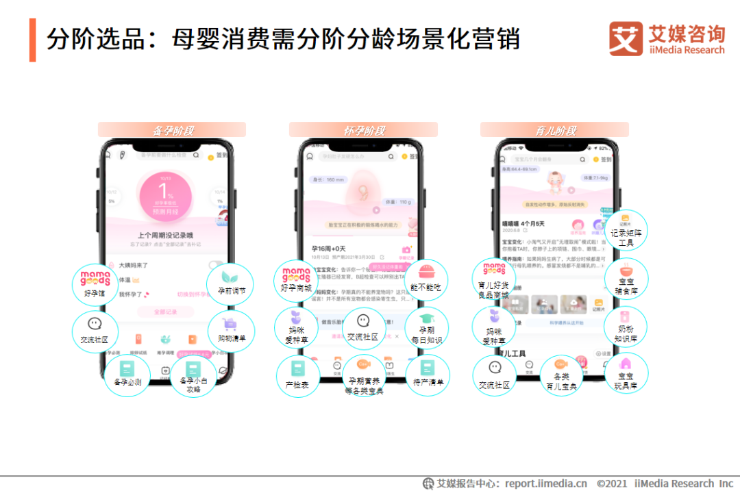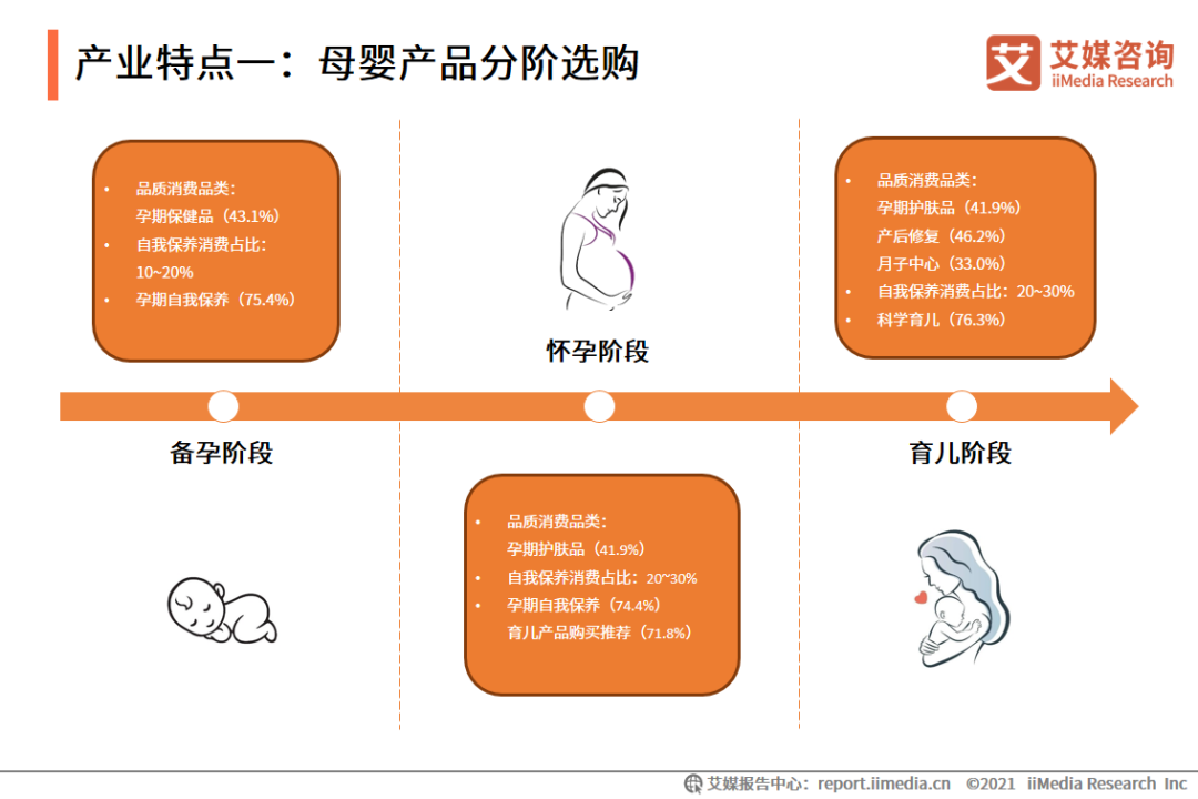 不同于其他行業,母嬰消費市場分階分齡選品特征明顯。由于母嬰選品過程周期短且不可逆,品牌必須精準把握各階段特點進行有效的信息投放及市場教育。艾媒咨詢分析師認為,孕母使用頻率且信任度最高的頭部母嬰垂直平臺,會對孕育階段進行全生命周期管理,充分運用母垂平臺記錄用戶的孕育階段并定期推送相關孕育階段知識資訊及選品清單的能力,可以極大地縮短母嬰消費的決策路徑,進行品牌“種草”。