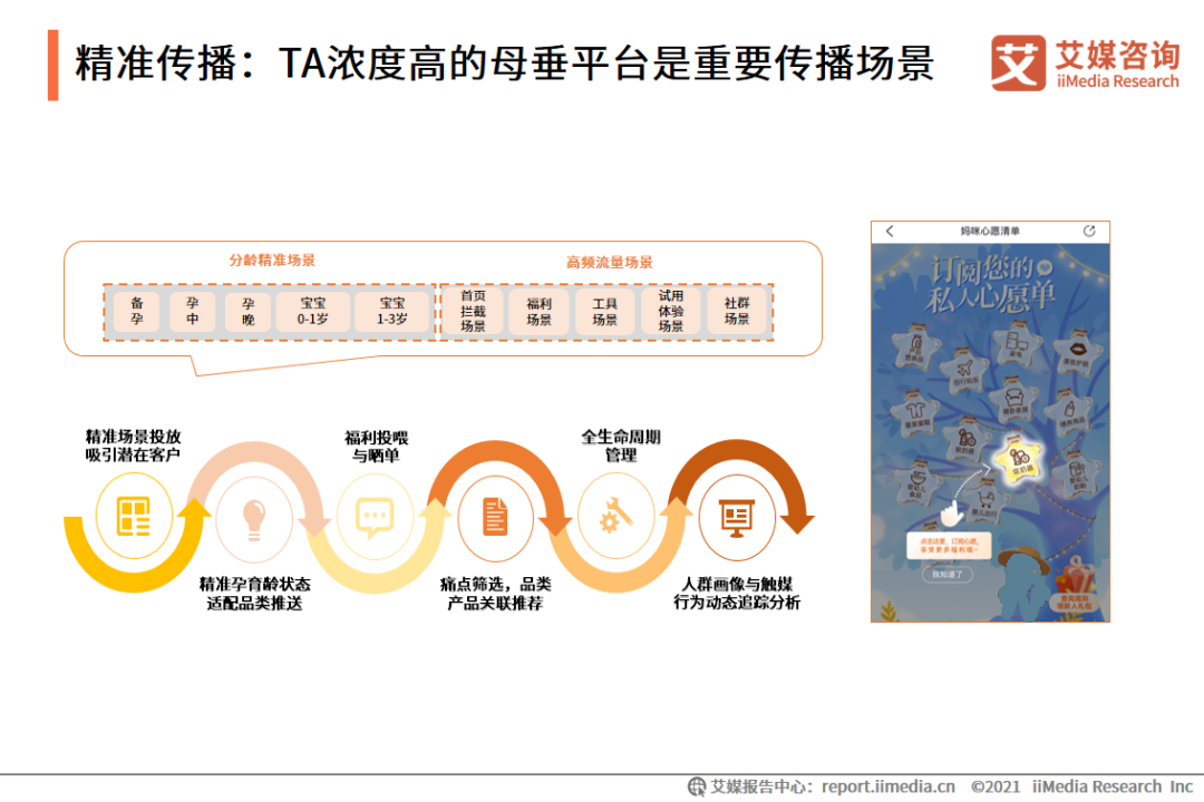 由于母嬰產品的選購時間有限,并且需要分階選品,因此抓住黃金時期的精準傳播,成為品牌制勝關鍵。艾媒咨詢分析師認為,從當前的孕母資訊獲取及“種草”方式看,頭部母垂平臺的使用率明顯更高。以其中獨占率最高的媽媽網為例,可以通過分齡精準場景和高頻流量場景獲得精準用戶,并且通過用戶的全生育周期管理。實現分階段的精準信息傳遞。