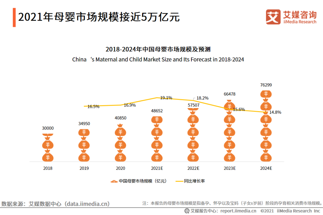 疫情影響下,直播電商模式進一步推動母嬰電商逆勢上揚,直播場次及訂單數量都有明顯增長。iiMedia Research(艾媒咨詢)數據顯示,2020年中國母嬰行業市場規模達到40850億元,預計2024年中國母嬰行業市場規模超過76000億元,成為中國消費市場中主要的行業組成部分。