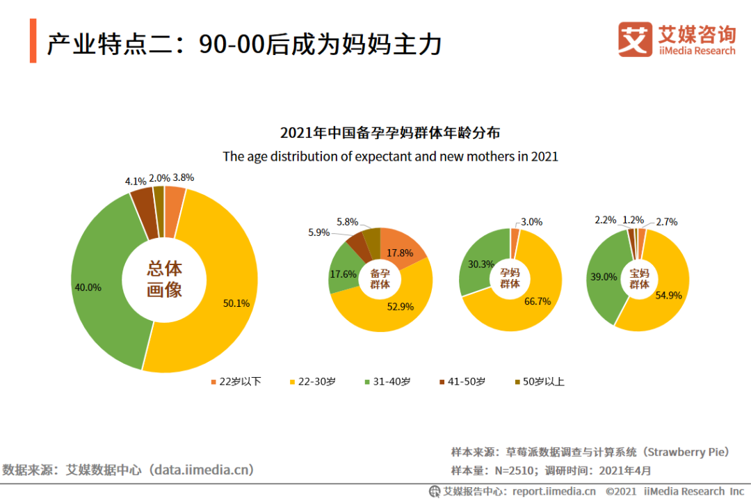 iiMedia Research(艾媒咨詢)調研數據顯示,年輕一代的中國女性群體已經逐步進入備孕/懷孕年齡段,備孕群體中,90后(22-30歲)群體占比52.9%,而00后(22歲以下)群體占比為17.8%。換言之,當前的孕媽群體主要以90-00年代為主,也逐步納入00后群體。