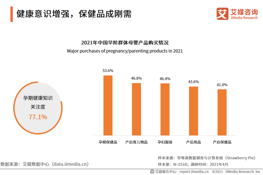 數據顯示,中國早階群體對于孕期胎兒養護和自身護理的相關知識關注度為77.1%,孕期保健品、產后保健品等都是早階群體購買的主要產品。艾媒咨詢分析師認為,在大健康理念的盛行下,孕期保健品逐漸成為了早階群體的剛需品,母嬰平臺可以為早階群體提供相應的購買指導服務,滿足消費需求的同時也使得科學懷孕有據可依。