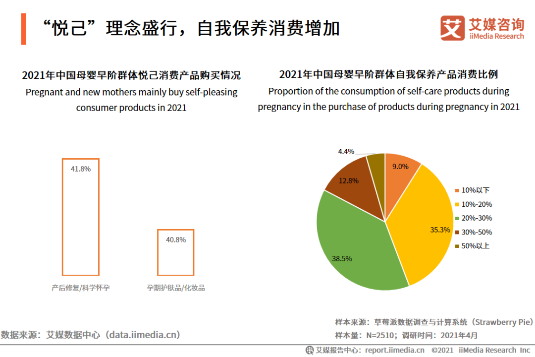 iiMedia Research(艾媒咨詢)數據顯示,產后修復和孕期護膚彩妝產品已成為母嬰早階群體主要購買的悅己產品之一,其中大部分孕媽在孕期自我保養類產品的消費占比處于10%-30%之間,有少部分孕媽此類消費支出更高。艾媒咨詢分析師發現,“悅己”消費也正日益成為女性主流消費模式,尤其是新生代孕媽,她們的思想更加進步,對自身的關注更顯著,“取悅自己”正成為母嬰行業長期消費主題之一。