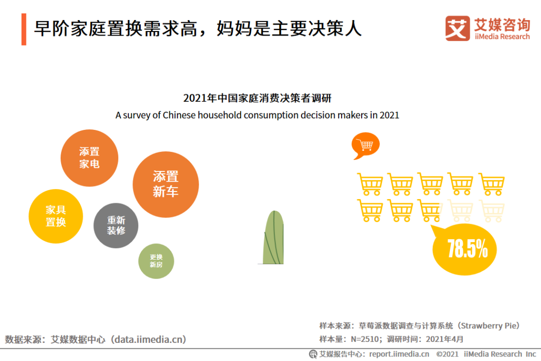 數據顯示,女性備孕懷孕后,家里會準備各種產品的置換或迭代,比如家電、家居、車子、房子等,大宗產品消費需求突出,并且做出購買決策者多為媽媽群體,占比78.5%。艾媒咨詢分析師認為,由于媽媽群體已經成為家庭消費的決策人,因而產品的品牌形象、產品迭代到營銷方式都需要迎合媽媽需求,并且可以在媽媽信任度高的母嬰垂直平臺,如媽媽網,進行做精準場景的商品適配和品牌教育,顯得尤為重要。
