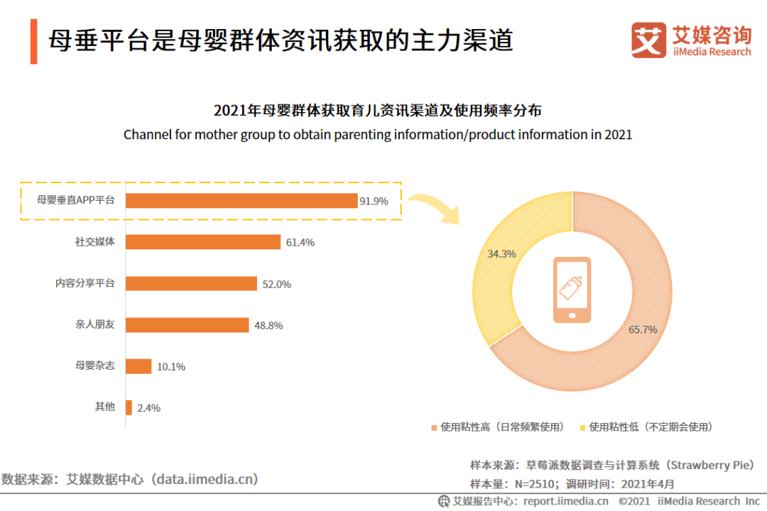 iiMedia Research(艾媒咨詢)調研數據顯示,超過九成母嬰群體都會從母垂平臺獲取相關資訊,其中65.7%母嬰群體會將母垂平臺作為日常頻繁使用的APP。艾媒咨詢分析師認為,對于母嬰群體來說,母嬰垂直平臺相比社交平臺和內容分享平臺等渠道有著科學、全面、專業、易懂的優勢,因此信任度也會更高。目前,母垂平臺已成為母嬰群體獲取知識和資訊的主力渠道。