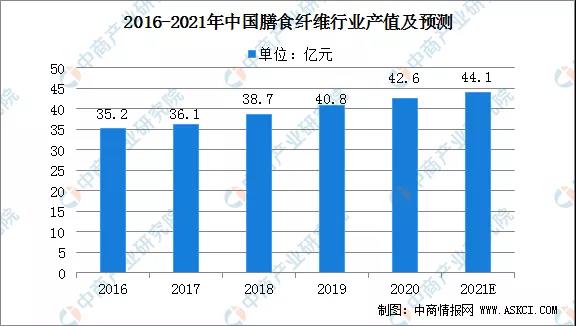 2016年,我國膳食纖維行業總產值約35.2億元,2020年上升至42.6億元。預計到2021年,我國膳食纖維行業總產值將達到44.1億元。