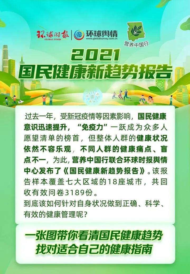 《2021國民健康新趨勢報告》由營養中國行與環球時報輿情中心聯合發布,覆蓋七大區域的18座城市,3189份樣本量,重點解讀全人群與特定人群健康趨勢。