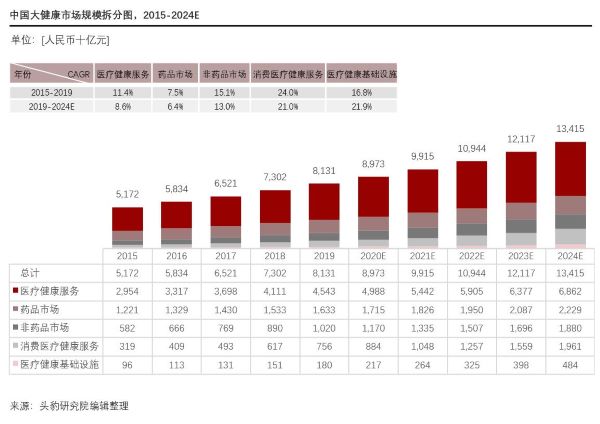與此同時,中國大健康產業市場規模保持穩定增長,2015到2019年,中國大健康產業的市場規模由5.2萬億人民幣增至8.1萬億人民幣,并預計將繼續提升,到2024年達到約13.4萬億人民幣。
