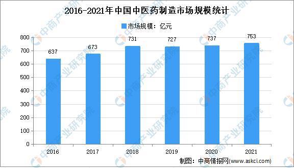 中國(guó)是僅次于美國(guó)的全球第二大制藥市場(chǎng)。其中,我國(guó)中藥制造市場(chǎng)從2016年637億元增至2020年737億元,年均復(fù)合增長(zhǎng)率為3.7%。2021年我國(guó)中藥制藥市場(chǎng)規(guī)模達(dá)到753億元,呈上升趨勢(shì)。