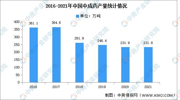 近年來(lái)全國(guó)中成藥產(chǎn)量持續(xù)下降,2021年12月全國(guó)中成藥產(chǎn)量為24.6萬(wàn)噸,同比下降3.9%。2021年全國(guó)中成藥產(chǎn)量為231.8萬(wàn)噸,同比下降0.04%。