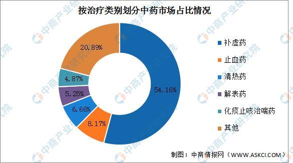 按治療類別劃分,中藥市場(chǎng)前五分別為補(bǔ)虛藥、止血藥、清熱藥、解表藥、化痰止咳治喘藥。其中,補(bǔ)虛藥獨(dú)占鰲頭,占比達(dá)54.16%,超過(guò)一半。止血藥、清熱藥、解表藥、化痰止咳治喘藥占比分別為8.17%、6.66%、5.25%及4.87%。