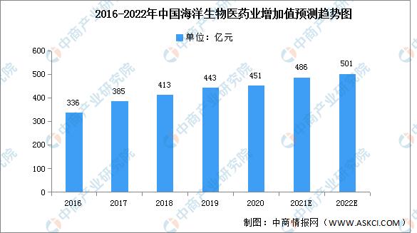 借助國家“藍色經濟”戰(zhàn)略,中國海洋生物醫(yī)藥產業(yè)呈現(xiàn)出快速發(fā)展態(tài)勢,是近年來海洋產業(yè)中增長較快的領域。據自然資源部數據,2016年中國海洋生物醫(yī)藥增加值僅336億元,2020年中國海洋生物醫(yī)藥研發(fā)力度不斷加大,產業(yè)增勢穩(wěn)健,原料藥延續(xù)較快發(fā)展態(tài)勢,全年實現(xiàn)增加值451億元,比上年增長8.0%。中商產業(yè)研究院預計,2022年中國海洋生物醫(yī)藥增加值將達501億元。