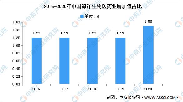 海洋生物醫(yī)藥業(yè)較快增長,產業(yè)增加值占海洋生產總值比例提高。2016-2019年中國海洋生物醫(yī)藥產業(yè)增加值占比均為1.2%,2020年提高至1.5%。