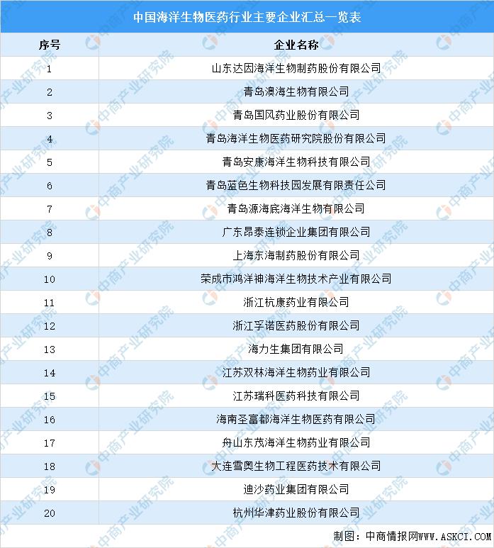 隨著藍色經濟熱潮的興起,沿海各省紛紛加大了對海洋生物醫(yī)藥行業(yè)的投入,初步形成了山東、廣東、浙江、福建、廣西海洋生物醫(yī)藥產業(yè)集聚區(qū)。山東省海洋局局長張建東表示,山東是海洋生物醫(yī)藥產業(yè)大省,產值超過200億元,約占全國比重的一半。山東聚集了全國80%以上的海洋藥物研究資源和力量。下圖為我國海洋生物醫(yī)藥行業(yè)主要企業(yè)匯總一覽表: