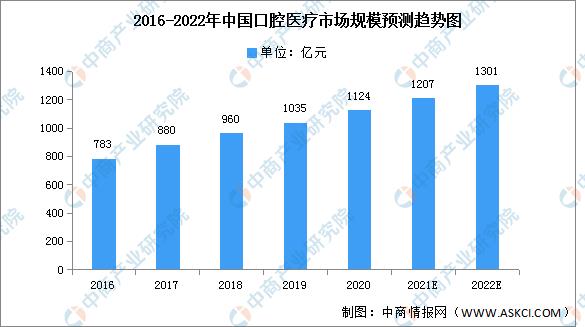 我國口腔醫療機構的主要經營業務包括口腔外科、口腔內科、口腔修復、口腔正畸、牙齒美白等。數據顯示,2016-2020年我國口腔醫療市場規模由783億元增至1124億元,年均復合增長率為9.46%。中商產業研究院預測,2022年我國口腔醫療市場規模可達1301億元。