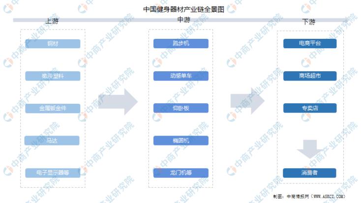 健身器材上游為各類原材料,包括鋼材、橡膠塑料、金屬鈑金件、馬達、電子顯示器等;中游為各類健身器材,包括跑步機、動感單車、仰臥板、橢圓機、龍門機等;下游為各類銷售平臺,最終到終端消費者。
