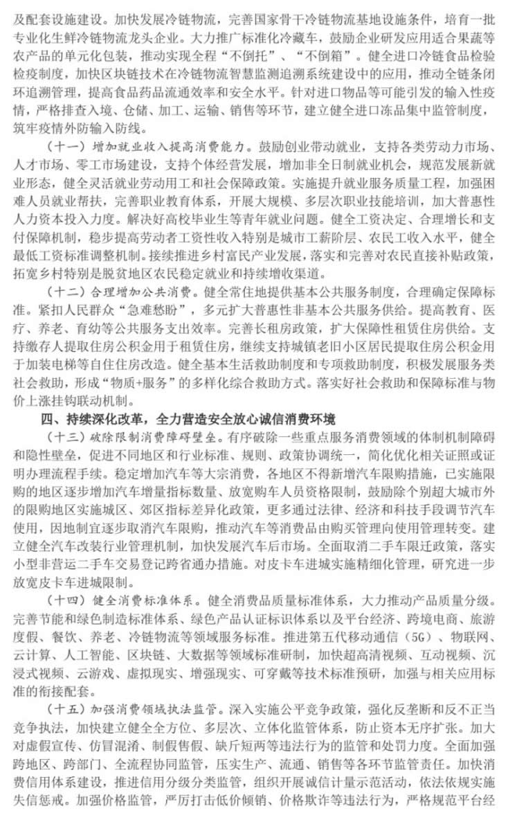 消費是最終需求,是暢通國內大循環的關鍵環節和重要引擎,對經濟具有持久拉動力,事關保障和改善民生。當前,受新冠肺炎疫情等因素影響,消費特別是接觸型消費恢復較慢,中小微企業、個體工商戶和服務業領域面臨較多困難。為深入貫徹習近平新時代中國特色社會主義思想,完整、準確、全面貫徹新發展理念,加快構建新發展格局,協同發力、遠近兼顧,綜合施策釋放消費潛力,促進消費持續恢復,經國務院同意,現提出以下意見。