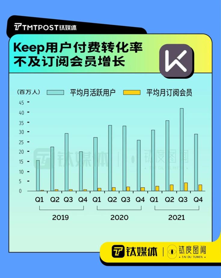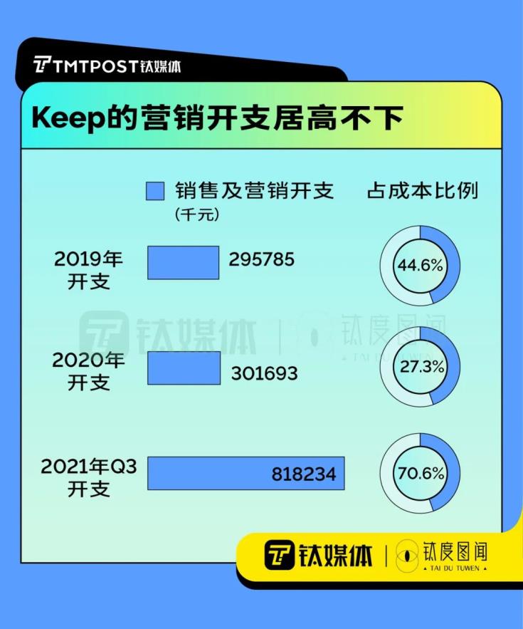 另一方面,Keep用戶付費(fèi)轉(zhuǎn)化率不及訂閱會員增長率,為了改善這一現(xiàn)狀,Keep開始在營銷上大做文章。這導(dǎo)致銷售及營銷開支的投入與平均月活躍用戶增速差距加大,Keep2020年銷售及營銷開支同比僅增2%,2021年整年銷售及營銷開支至少同比增172%,而2021年整年月活躍用戶增速僅為15.8%。