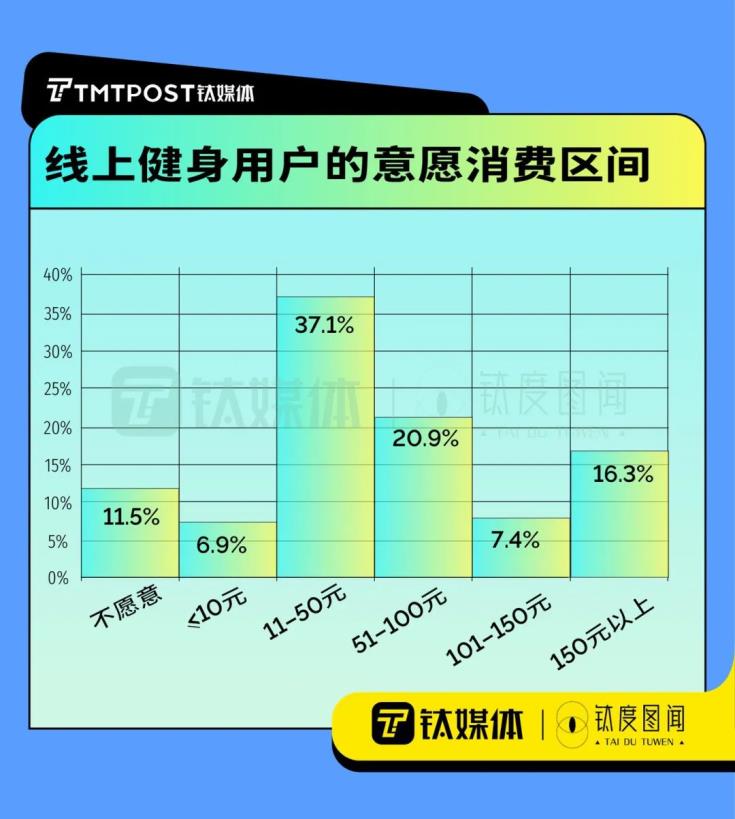 可見,目前中國健身人群尚未建立起線上消費(fèi)意識。這一點(diǎn),在精練GymSquare發(fā)布的《2020中國健身行業(yè)報(bào)告》中也有所印證,目前中國線上健身者的付費(fèi)數(shù)據(jù)顯示,11-50元/月是最集中的消費(fèi)區(qū)間,人數(shù)占比超過37%;愿意付費(fèi)高于50元/月的用戶,只有不足30%;此外11.5%的線上健身用戶,表示不愿意付費(fèi)。