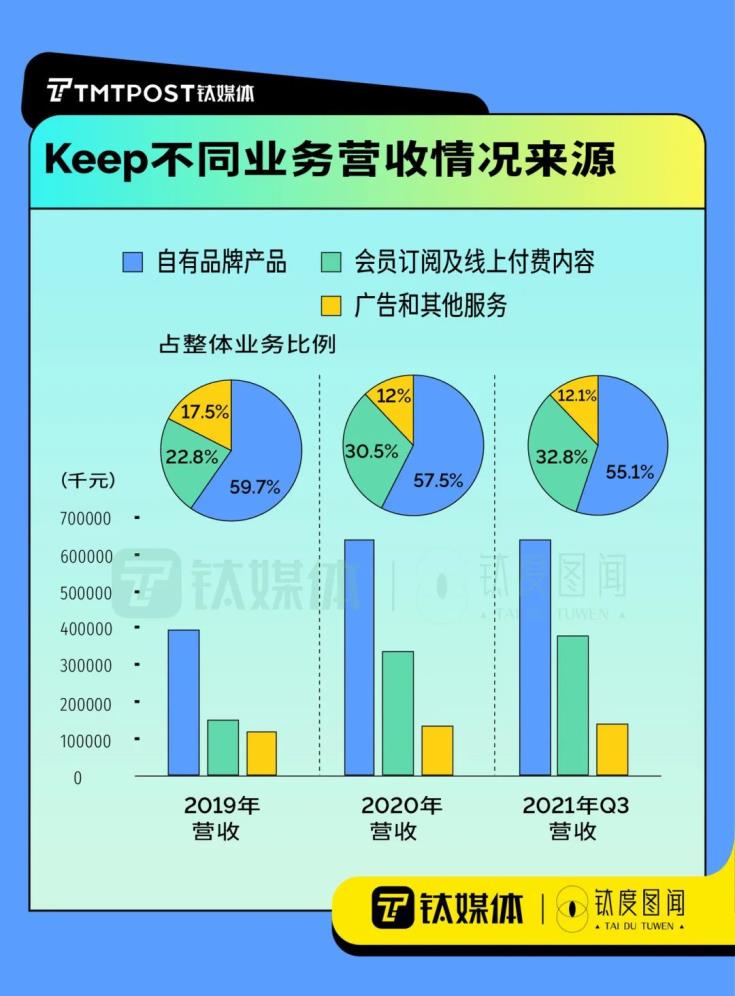 招股書顯示,2019年,keep的訂閱會員有80萬,2020年這一數(shù)字增長至330萬,結(jié)合活躍用戶的數(shù)據(jù)看,使用keep的人中僅有不到10%愿意為keep上的內(nèi)容掏腰包。2020年,keep來自會員訂閱及線上付費(fèi)內(nèi)容收入為3.38億元,占總收入的比例為30.5%,同比增加123.84%。2021年前三季度,這部分收入為3.80億元,同比增加52.61%,占總收入的比例為32.8%。