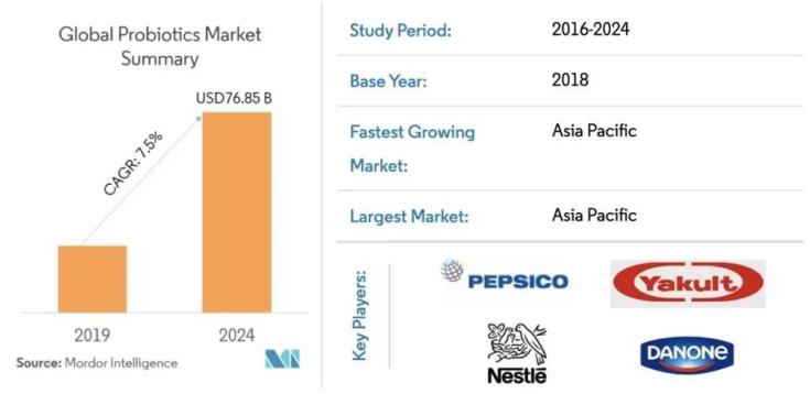 根據(jù)Mordor Intellgence的預(yù)測,到2024年,全球益生菌市場預(yù)計(jì)將達(dá)到768.5億美元,在預(yù)測期內(nèi)(2019年至2024年),年增長率預(yù)計(jì)為7.5%m,這在全球總體經(jīng)濟(jì)下行的趨勢下,顯得格外亮眼。