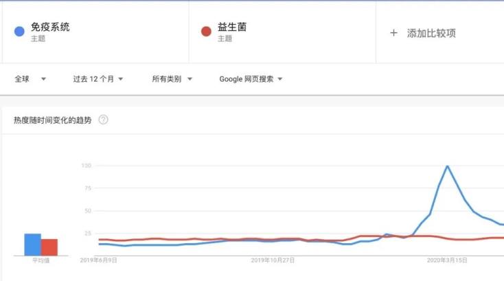 圖注:Google指數(shù)中免疫系統(tǒng)與益生菌對比