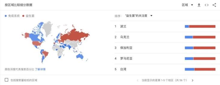 人們都在關(guān)注自己的免疫系統(tǒng),而提高免疫力可能有很多途徑,哪些地區(qū)的人們更關(guān)注益生菌對于免疫系統(tǒng)的提升情況呢?通過過去一年的搜索指數(shù)不難看出,歐洲消費(fèi)者對于益生菌的興趣更為濃厚,這跟該行業(yè)在該地區(qū)較久的發(fā)展歷史也有關(guān)系。