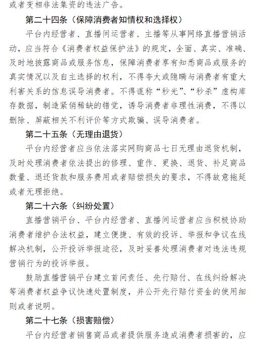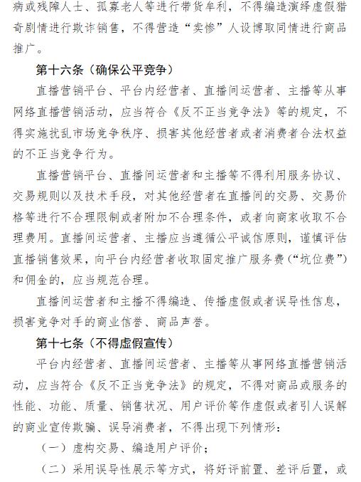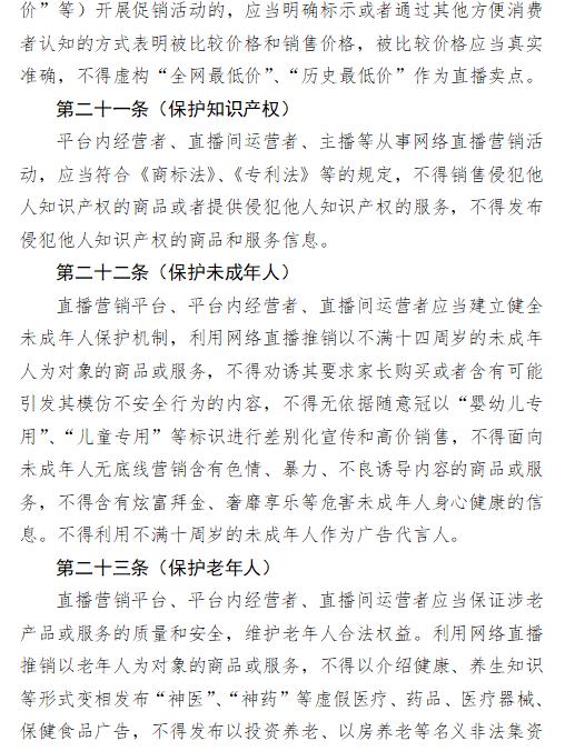 直播營銷平臺、平臺內經營者、直播間運營者應當保證涉老產品或服務的質量和安全,維護老年人合法權益。利用網絡直播推銷以老年人為對象的商品或服務,不得以介紹健康、養生知識等形式變相發布“神醫”、“神藥”等虛假醫療、藥品、醫療器械、保健食品廣告,不得發布以投資養老、以房養老等名義非法集資或者變相非法集資的違法廣告。