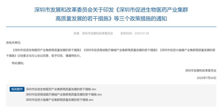 7月26日,深圳市發改委發布了三條重磅政策措施,包括《深圳市培育發展大健康產業集群行動計劃(2022-2025年)》《深圳市促進生物醫藥產業集群高質量發展的若干措施》《深圳市促進高端醫療器械產業集群高質量發展的若干措施》》,培育大健康行動計劃中提到建設國內一流、國際領先的大健康產業集群,包括鼓勵建設國內一流康復養老護理機構、醫療美容機構、健康管理機構,優化促進大健康產業營商環境等一系列利好政策。