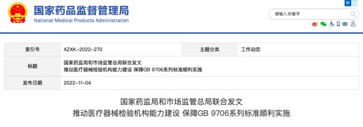 2022年11月4日,國家藥監(jiān)局和市場監(jiān)管總局聯(lián)合發(fā)文推動醫(yī)療器械檢驗機構(gòu)能力建設(shè) 保障GB 9706系列標(biāo)準(zhǔn)順利實施。