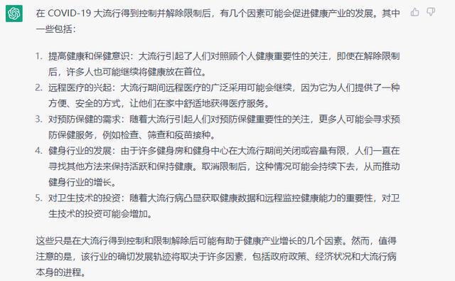 它從健康意識(shí)、遠(yuǎn)程醫(yī)療、消費(fèi)者健康需求、健身、衛(wèi)生技術(shù)投資5個(gè)方面來(lái)解答了,不過(guò)神來(lái)之筆是末尾那段轉(zhuǎn)折,越看越覺(jué)得“ChatGPT”在演“上岸人”。